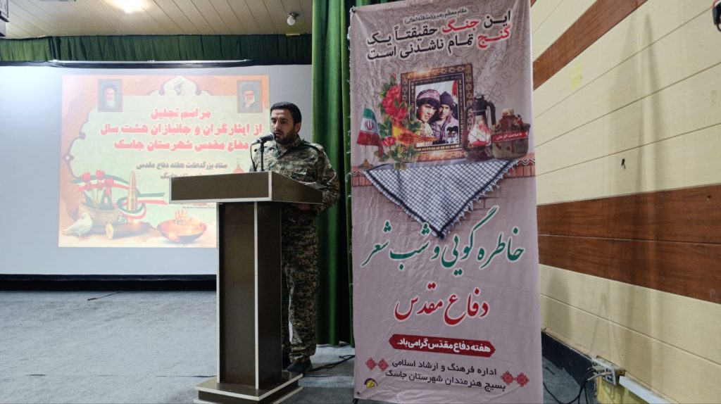 سرهنگ نکوییزاده، فرمانده ناحیه مقاومت بسیج سپاه جاسک، ضمن قدردانی از همراهی و پشتیبانی صمیمانه امام جمعه، فرماندار و مجموعه ارتش در حمایت و همکاری با برنامههای هفته دفاع مقدس، به ایراد سخن پرداخت.